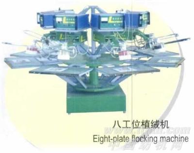 多套色植绒印花联合机 本机使用于水浆,胶浆,油墨等多种印花和多色植绒,可分开或同时操作,植绒印花时间为6—10秒,有20—30个工位,半自动控制,最多可4色植绒+6色印花,并配有全封闭植绒箱,台