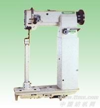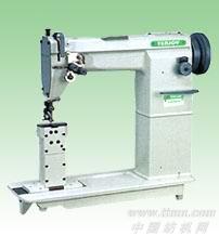 TJ836单针高头缝纫机 采用连杆挑线,立柱旋转勾线,形成单线锁式线迹。上下轴采用螺旋伞轮转动。采用立柱式缝台及滚轮压脚(或一般压脚)。适用于皮鞋、运动鞋、皮包等类似物品的曲线缝制。型号:TJ836