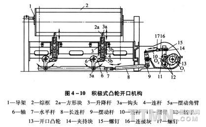片梭织机的开口机构主要有:积极式凸轮开口机构、积极式多臂机、大提花机(双动程、全开口)以及高速边字提花机等。 一、积极式踏盘开口机构 积极式凸轮开口机构是最为简单可靠的开口机构,可织造4、5、6、7和8纬循环织物,最多可装10~14片棕框,采用共轭凸轮积极控制综框运动,通过对凸轮曲线的设计,优化了综框运动规律,使综框的运动平稳和谐。另外凸轮开口机构梭口调节容易,设有自动梭口平齐装置。 积极式凸轮开口机构的结构如图4-10所示。在凸轮轴O1上共有10组开口凸轮13,每两只相互共轭的开口凸轮组成一组。摆臂ll上的两只转子12分别与相互共轭的两只开口凸轮的表面接触。当开口凸轮13回转时,通过转子12使摆臂11以轴O2为中心摆动。摆臂上端有夹持块14,依靠螺钉15而紧固于摆臂11的上端。连杆10的一端与摆动杆9的上端呈铰链式联结;连杆lO的另一端伸入连接块16的一端的孔中,依靠螺钉17使两者联结,连接块16的另一端与夹持块14呈铰链式联结。摆动杆9的下端通过长连杆8而与水平杆7的一端相连结,水平杆7又通过两根销轴5a,与两只摆动角臂5连接。当摆臂11摆动时,通过夹持块14、连接块16、连杆10,使摆动杆9也发生摆动,又通过长连杆8、水平杆7,使摆动角臂5以轴6为中心做摆动运动。摆动角臂的另一臂通过销轴5b而与连杆4呈铰链式联结,连杆4又通过销轴3b与升降杆3呈铰链式联结。升降杆3的上端具有钩头3a,它可以伸入综框架2的孔中,并与固装在综框架2内的方形块2a互相钩住。当摆动角臂5摆动时,通过连杆4、升降杆3,而使综框架2在导架1的导槽内作升降运动。