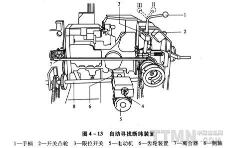 在织机正常运转时,定位开关9的触头位于连接圆盘7的缺口8中,定位开关12的触头12a位于连接圆盘10的缺口11中。这时电动机6没有供电,自动平综装置不起作用。 在织机停止时,按下按钮5,电动机6启动,回转180°,此时定位开关9的触头位于连接圆盘7的缺口8a中,而定位开关12的触头12a位于连接圆盘10的表面,由于定位开关12的作用,织机不能启动。这时综框处于平综位置。再按下按钮5,电动机6启动,又回转180°,这时两个定位开关9和定位开关12回复到原来的位置。 P7300型片梭织机自动平综装置具有两种平综位置: (1)把所有综框平齐在同一位置,以调节综框高度或更换开口凸轮。 (2)为自动寻纬把综杆平齐,但综框仅仅放平而未被举起,这样,使用自动寻纬装置,可以不移动综框,被织人的最后一根纬纱张力保持不变。 三、自动寻找断纬装置 片梭织机自动寻找断纬装置如图4一13所示。为了寻找断纬可使手柄1从位置I转到位置Ⅲ,然后再转回到位置Ⅱ,此时自动寻找断纬装置发生以下动作: