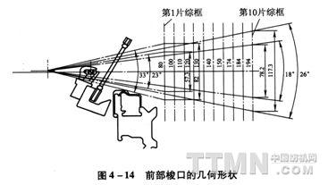 (1)在手柄1处于位置I时,手柄1上的开关凸轮2推动限位开关3,限位开关3又使齿轮装置6的电磁离合器啮合,这样齿轮装置6就和侧轴8相互连接在一起。 (2)在位置Ⅱ、Ⅲ时,找断纬离合器7脱开,这时侧轴8与主机脱开,可以自由转动。 (3)在位置Ⅲ时,限位开关3转到第二级位置时,电动机5启动。电动机5通过齿轮装置6往后转。带动凸轮反转,使综框反向运动,而织机不动。 (4)精确转动一纬后,找断纬离合器7就自动啮合,并通过开关凸轮2和限位开关3,将找断纬装置的电驱动机构断开。手柄l回到初始位置I。 手柄1的位置: 位置I:找断纬离合器7啮合。 位置Ⅱ:找断纬离合器7脱开。当织机转一纬后,它又重新啮合。 位置Ⅲ:找断纬离合器7脱开,手柄1已越过死点,找断纬离合器7不能啮合。 四、P7300型片梭织机的梭口形状 P7300型片梭织机前部梭口的几何形状,可调节成对称梭口,梭口的开口角度调节范围在12°~33°(10片踏盘的开口角度18°~33°),钢筘的打纬角向经纱边倾斜4°,如图4—14所示。