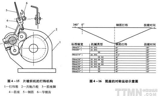 通过优化设计共轭凸轮的曲线,使筘座打纬运动为对称运动曲线,即向前运动的时间和向后运动的时间相等。筘座的对称运动如图4—16所示。筘座质量轻,在片梭飞行时,筘座在后死心位置静止不动。钢筘的打纬角向经纱一边倾斜4°,以便优化织物外观。采用楔形筘夹,8 mm厚的筘条为标准型,12 mm厚的筘条为双排筘和织筛网的钢筘。