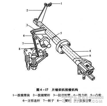 片梭织机的引纬机构是投梭机构,如图4—17所示,它是以无撞击的形式将夹持纬纱的片梭加速投向投梭点。