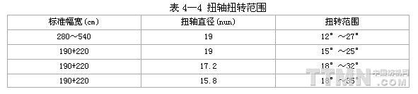 片梭织机的投梭机构投梭所需要的能量是通过扭力杆4产生的,当凸轮5回转时,推动三臂杆8上的转子7,并使三臂杆摆动。三臂杆摆动时,推动方形连杆6,拉动短臂3,并使投梭套管9回转。由于投梭套管的前端与扭轴是固定的,使扭轴发生扭转,在扭轴内部就产生了弹性应力,积蓄了弹性能量,在扭轴加扭过程中,投梭臂杆2随同投梭套管同时摆动,使投梭滑块1回退到最左侧的投梭起始位置。直到三臂杆8与方形连杆6处于死心位置时即三臂杆8的摆动中心,三臂杆8与方形连杆6的联结点和方形连杆6与短臂3的联结点三点连成一条直线时,扭轴的加扭过程结束。当凸轮5继续回转时,位于凸轮两侧面的两只转子与三臂杆8的曲面接触,并使三臂杆转动,破坏了三臂杆摆动中心,三臂杆与方形连杆联结点和方形连杆与短臂联结点的三点死心位置,扭轴就开始释放出贮存的弹性能量。扭轴在放出能量时,使投梭套管急速顺时针方向转动,通过投梭杆2和投梭滑块1把片梭加速投出,为了吸收投梭过程中投梭机构的残余惯性力,在片梭织机上装有液压缓冲器。 片梭织机不同幅宽,扭轴直径不同,其扭轴扭转范围也不同,下面是片梭织机的扭轴扭转范围,见表4—4。