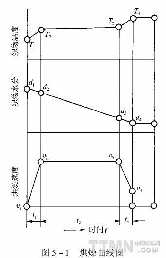 在织物烘燥的全过程中,必须具备以下两个条件,才能满足烘燥过程的进行。 (1)蒸发织物中水分所必需的热量。 (2)为带走蒸发水分所必需的水蒸气分压力梯度。 当以上两个条件协调一致时,可达到最理想的烘燥效果。 图5—1是织物在烘燥过程中温度、水分及烘燥速度与烘燥时间的关系曲线。由图可知,织物进入烘燥机时,其温度为T1,含水分d1。经过一段时间t1的烘燥后,织物的温度上升至T2,水分降为d2。在t1这段时间中,烘燥机提供给织物的热能大部分用于织物升温,为烘燥消耗的热能很少,织物中水分d2≈d1。因此,称时间间隔t1为升速烘燥区。当织物温度达到T2后,烘燥正式开始。在t2这段时间内,给予织物的热量几乎全部用于蒸发织物中的水分,使它从d2降到d3,而织物的温度T3≈T2,时间间隔t2称为恒速烘燥区。织物的烘燥过程大部分是在这个区域里完成的。随着烘燥过程的继续进行当织物中的水分达到d3后,接近其临界值,烘燥速度随之降低,织物温度继续上升至T4,织物含水率达到其临界值d4时,烘燥过程中止。时间间隔t3称为降速烘燥区。因此,烘燥的速度曲线具有梯形特征。 织物在烘燥过程中的升温是依靠热传导、热对流和热辐射三种基本热交换形式来实现的。 当高温物体与低温物体直接接触时,热量由高温物体传递到低温物体,或在同一物体中,其中一部分温度较高,另一部分温度较低,热量由高温部分向低温部分传递的物理过程,称为传导传热或热传导。烘筒烘燥机就是利用加热的金属表面与织物表面相接触而传递热量给织物,汽化织物中的水分,从而使之烘干。 当流体一部分受热时, 因其密度的变化而发生流动,从而引起热量的传递,称为对流传热或热对流。由于流体本身各部分密度不同而引起的流动称为“自然对流”。若流体的流动是由于风机等作用而引起的,称为“强制对流”。热风烘燥机、焙烘机及热定形机就是应用加热的空气吹向织物表面而传递热量,从织物中汽化出来的水分,仍由这些热空气带走。 以电磁波形式通过空间进行热量传递的过程,称为辐射传热或热辐射。在烘燥机中,一般采用红外线或远红外线等辐射传热。