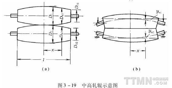 提高轧液均匀度的方法: 影响轧液均匀度的因素很多,如轧压压力、轧辊表面硬度以及轧辊刚度等。而轧辊的刚度,则是影响轧液均匀度的主要结构因素。因此,提高轧辊刚度是提高轧液均匀度的根本措 施。但是,这又会引起整个轧车结构的笨重,增加能量的消耗和搬运安装的困难。 从轧辊结构考虑,在不过分增大其截面的前提下,尽可能减少轧辊的挠度,以提高轧液均匀度,是优化轧辊设计的重要课题之一。目前常采用的有中高轧辊、中支轧辊和中固轧辊等。 由于普通轧辊两端受集中载荷,辊体受均布载荷,易产生弯曲变形。这种弯曲变形,使轧辊间的线压力形成中间小两端大的分布,造成轧液不匀。图3—19(a)是中高轧辊示意图。