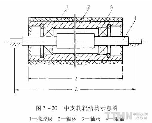 这种轧辊的辊体做成中间大、两头小的橄榄状。由于辊体的直径中间大于两端,迫使中间线压力增加而两端线压力减小。如果中间的修正值选择合适,使它与轧辊加压后弯曲变形的挠度值相同,即可以使辊体工作表面均匀接触,轧点接触线完全勿合,取得轧液均匀的效果,如图3—19(b)所示。在实际生产中,轧车的压力常常因工艺条件的变化而改变。但这种轧辊结构简单,制造方便,在印染厂使用比较普遍。 图3—20是中支轧辊的结构示意图。这种轧辊辊体的支点内移,相当于减小了房梁的跨