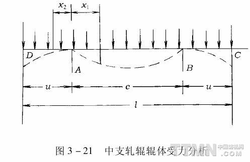 距。在同样的载荷条件下,挠度减小,即减小了轧液的不均匀度。 将辊体简化成简支梁,其受力状况如图3—21所示,挠度只是减小,而未消失。因此,