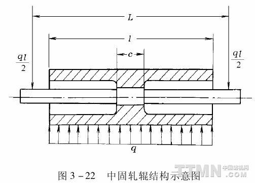 整个纬向的轧液均匀性问题并未解决。但是,如果能使轧辊的中间挠度和两端挠度相等,则可以解决中浅边深的色差。通过计算可知,此时轧辊的挠度已大大减小,其最大值仅为普通轧辊的20%,因此,对提高轧液均匀度有一定的效果。设辊体长度为l,则此时辊体两支点的内移量为:u=0.223l 图3-22是中固轧辊的结构示意图。它的辊体,仅中部一段与辊轴紧固连接。与普通轧