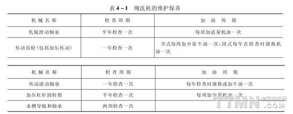 3~5槽,依次在槽内浸渍井在两轧辊间进行轧洗,最后经小轧车轧液后出布。 轧槽一般用铸铁制成,上口是敞开的,槽底为圆弧形。槽中装有一块带孔的隔板,将槽分隔成前后两部分。隔板上部装有分布棒,用以分隔出槽的布环。隔板下边装有直接蒸汽管,便于加热洗液,槽侧装有进水管及溢水口,槽底装有放液塞。槽口上绳状织物进槽处装有方形辊,将织物摆动入槽。槽内无导布辊。槽上轧辊、轴承、机架、传动设备等均与老式紧式绳洗机相似。 三、绳洗机的维护保养和常见故障的处理 1.紧式绳洗机的维护保养 紧式绳洗机维护保养方法见表4—1