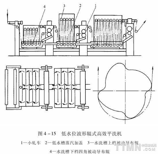 如何提高洗涤效率,即既提高水洗效果,又节约用水,这是目前染整生产中的一个重要课题。目前是以较少的设备,最少的洗涤剂,在最短的时间内完成对织物的净洗任务。这就应该从选用合理的净洗工艺和改善洗涤设备两方面去研究解决。从净洗工艺方面看,应考虑水的硬度、洗涤剂的去污能力、洗液中洗涤剂的浓度、洗液温度、纤维性质、污物特点及洗涤时间等因素。而从设备方面来看,则是如何保持洗液与污物的较大浓度差,加速洗液的交换,减薄和破坏固液相边界层等。目前,在这方面采取的主要措施有逆流洗涤、高温蒸洗、强力喷轧(或强力喷吸)、机械振荡和延长洗涤的作用时间等。 1.提高洗涤效果的设备措施 图4—15所示为低水位波形辊式高效干洗机,它的结构特点如下: