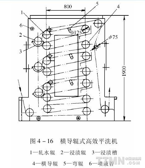 (1)常压液封热洗:顶羔口沿水封,进出布处由洗液封口,槽内温度最高可达98℃。织物在汽域中运行时间较长,这种蒸洗对洗碱、洗色酚及洗活性染料等效果极为显著。采用性能较好的汽水混合器,槽外加进热水(热水喷于进轧辊组轧点前的织物上),槽内加热保温的方法,耗汽少,槽内温度稳定,织物不易起皱。 (2)逆流低水位:除相邻洗槽间洗液逆流外,槽内还分格迂回逆流。同时,由于低水位、小浴比,洗液更换快,利用充分,且有利于织物上的污物向洗液扩散,耗水、耗汽少。 (3)多浸多轧:槽内每根上导辊上斜装一根直径为30mm的耐热合成橡胶压辊,借自重加压,使织物多浸多轧。 (4)低频振荡:每槽被动下导辊的中间凹根为四角导布辊(即波形辊),能使织物产生低频振荡,井搅动洗液,促使织物上的洗液快速交换。 图4—16所示为横导辊式高效干洗机,它的结构特点如下: