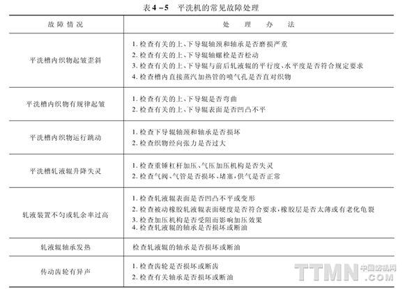①织物横穿、洗液逆流:织物自槽底进入洗槽后,在导辊间由下而上横穿运行。用泵将出口处污物浓度最低的洗液,经汽水混合器加热后,送柱浸渍槽中帅洗,井以逆流方式流经各层织物。由于横穿运行的织物在导辊间多次改变运行方向,致使自槽顶向下种洗逆流的洗液,借其贯流作用,能反复多次地从正反两面透过织物,有利于洗液充分逆流和织物上洗液交换,耗水少、净洗效率高。 ②常压液割热洗:洗槽基本密割,织物进口采用水割。除用汽水混合器加热帅洗的洗液外,在洗槽底部有直接蒸汽管加热。槽内洗液可接近常压下沸点水温。 ②多浸多轧:槽内除装有小型浸渍槽和轧辊外,实际上,每根导布辊和防皱弯辊都有一定的挤液作用,故织物是在多浸多轧和洗液清浊分流的情况下净洗的。 ④低水位、小浴比:洗槽底部的大洗液槽液面高度仅230mm,容量较小:小浸渍槽的容量则更小。因此,洗液更新快,有利于织物上的污染杂质向洗液扩散。 由此可见,一台高效干洗机,往往是多方面综合考虑后改进设计的。 干洗机的一般维护保养和常见故障处理见表4—4和表4—5。