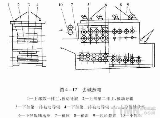 2.综合高效净洗设备 净洗用汽蒸箱是供织物染色、印花后处理时,进行皂煮、热水蒸洗及丝光蒸洗去碱的一类常压汽蒸设备,其使用目的是为了净洗。因而,其基本结构与干洗机有某些相似之处。但是,由于这是一种汽液双相形式的蒸洗,有较高温度和较大的渗透作用,因此,使洗涤的速度和效果都有所提高。常温织物进入汽蒸箱后与高湿蒸汽相遇,自身的温度升高,纤维膨胀,污物活性增加。蒸汽冷凝后的液滴吸引污物分子,使其浓度降低,随织物进入蒸箱下部洗液中而洗去。如此循环,织物很快被洗净。 图4—17所示为去碱蒸箱,供双层丝光织物蒸洗去碱。蒸洗箱上部有两排导布辊,第一