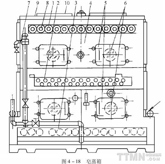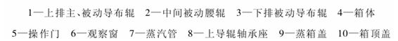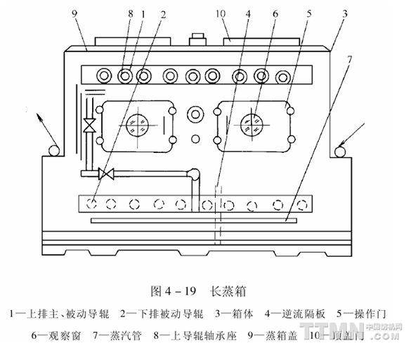 图4—19所示为长蒸箱,除叫皂蒸、热蒸外,也叫喊蒸。箱中装有上下两排导布辊,上排9根,奇数为土动辊,均由力矩电动机单独驱动。下排10根,均为被动导辊。