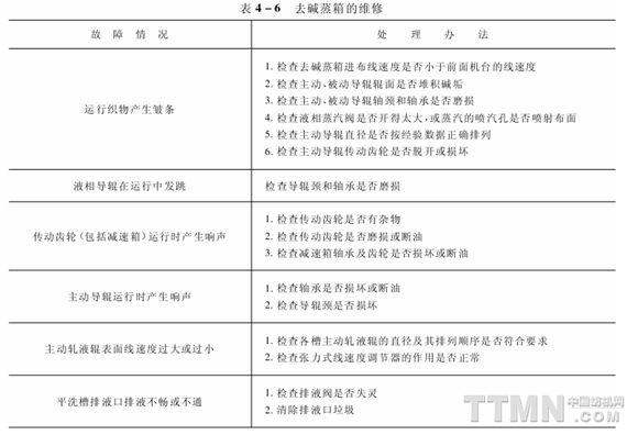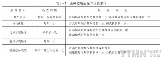 去碱蒸箱的维修和保养注意事项分别见表4—6和表4—7。 皂蒸箱和长蒸箱的维修保养注意事项也可参见表4—6和表4—7。