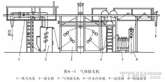 气体烧毛机由进布装置、刷毛箱、烧毛装置、灭火落布装置等主要部分组成,如图6—1所示,是目前使用最广泛的一种气体烧毛机。它结构简单,操作方便,燃料来源丰富,劳动强度较低,生产效率较高。