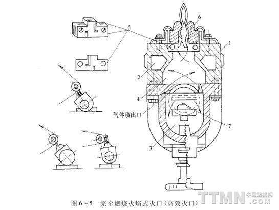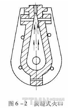 ②辐射与火焰混合式火口:图6—4所示为辐射式火口。它是在铸铁制成的火口上加装异形耐火砖。当火焰由火口喷射到织物表面进行烧毛时,织物对火焰及被它带动的热空气有一定的反射作用,使火焰和热空气反射到异形耐火砖上继续燃烧,井使耐火材料产生热辐射。这样,提高了烧毛温度和火焰的均匀性,增大了布面与火焰的接触面,从而提高了热效率,加快了车速。 ①完全燃烧火焰式火口:图6—5所示为完全燃烧火焰式火口。铸铁火口体的近火口处,