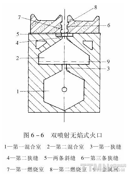 有两条冷却用的冷水通道,用来降低火口体的温度。火口体内有两个混合室。在第二混合室的上方,还安装有多层不锈钢叠片,彼此间形成细小的方孔,最上面是由两块能承受骤冷骤热的耐火砖(主要由碳化硅和刚玉黏合后烧结而成)构成的燃烧室和火口。 混合气进第一混合室,发生第一次膨胀,再由斜孔收缩后进入第二混合室,发生第二次膨胀,进入细方孔,再次收缩,使混合气充分混合,再喷入燃烧室燃烧。炽热的耐火砖又加速了混合气的燃烧速度,井使之燃烧完全,燃烧温度可达到1260℃。这种火口虽仍有部分火焰喷出,但热量利用充分,火口不易变形,火焰稳定性好,烧毛效率高。 ④无焰式火口:图6—6所示为双喷射无焰式火口。混合气进入第一混合室后膨胀,接