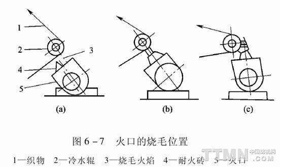 着在第一狭缝处突然受阻收缩,把能量转化为气体的混合能,进一步混合。然后,进入第二混合室充分膨胀,由金属网滤去杂质,在第二狭缝处再次受阻收缩后,经两条斜缝喷入第一燃烧室。由于喷射速度较快,形成一定的涡流,又提高了混合气的混合程度,再经第一、第二燃烧室预燃,几乎无火焰从火口喷出。这样热能消耗少,温度高,烧毛效果好,特别适宜于化纤织物的 烧毛。 近年来火口向由计算机控制方向发展,可以通过用火焰强度、布面温度、车速以及火口与织物之间的距离等凹项参数编制而成的自动控制程序,自动控制火焰强度,利用火口可以转动,能产生不同的烧毛位置,进而可以产生弱烧、中烧、强烧三种效果。如图6—7所示。