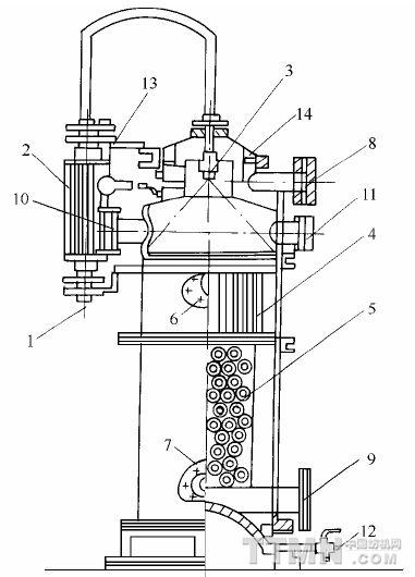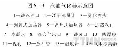 混合比例下才能完全燃烧,从而获得较高的温度。由于空气进口管口径大,出口管口径小,在出口处形成很高的气流,在其周围空间出现负压,把煤气按比例吸入混合,进入扩散管。扩散管的口径是逐渐增大的,混合气的流速逐渐降低,使混合气有一定的扩散混合时间,提高混合程度。 (3)汽油气化器:气体烧毛机所用的可燃性气体,主要有煤气、石油气和汽油气三种。 煤气发生炉是制造发生炉煤气、水煤气和半水煤气的装置,按照结构不同,有机械发生炉、阶梯发生炉、炉身转动发生炉和两段发生炉:按照工艺不同,有固定(为普通发生炉,以煤块为原料)和流动床(如沸腾炉,以煤粉为原料)等。一般煤气发生炉的炉体呈圆筒形,外壳用钢板或砖砌成,内衬耐火砖,井装有加料和排灰设备、鼓风管道、煤气管道等。气化过程是燃料中的炭与空气中的氧以及水蒸气相互作用的热化学反应过程,同时电进行着煤的干馏和干燥过程。气化煤气的热值较低,约4.18×106~12.5×106J/m3。 石油气来自石油中的C1~C4的烃类混合物:烧毛用的液化石油气含50%丙烃及50%丁烃,热值较高,为11.3×107~10.4×107J/m3。 从燃气来源及操作方便性等角度考虑,目前汽油气化器相对使用较多。汽油气化器可以快速地把液状汽油气化为可燃气体,供烧毛机使用。其结构如图6—9所示。气化器让汽油