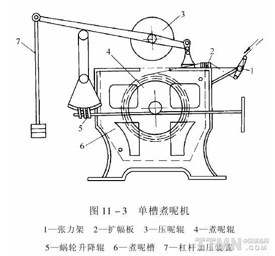 煮呢机: 煮呢是将毛织物在一定的张力和压力作用下,用热水浴处理一定的时间,使毛织物获得稳定的形态,耐久的光泽,柔软丰满的手感,井富有弹性,提高织物对染料的吸阳能力,是一种湿热定形工序。煮呢机有单槽煮呢机和双槽煮呢机,此外还有蒸煮联合机。 1. 单槽煮呢机 由煮呢辊、煮呢槽、压呢辊、加压装置及蜗轮升降装置等组成,其结构如图11—3所示。