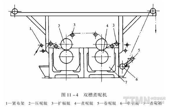 煮呢时,平幅织物经张力架、扩幅装置,保持平整状态卷绕于煮呢辊上。煮呢辊缓慢转动进行煮呢,煮呢结束后冷却出机。织物张力通过调整张力架的角度控制,煮呢温度由蒸汽加热控制装置调节,压呢辊的压力由加压装置来实现。 该机结构简单,占地面积小,煮呢后呢坯平整、光泽好、手感挺括井富有弹性。但煮呢过程中织物内外层温差较大,需调头煮呢,生产效率较低,且易产生水印。单槽煮呢机主要用于薄型毛织物煮呢。 2.双槽煮呢机 如图11—4所示,其结构与单槽煮呢机相似,它是由两台单槽煮呢机组合而成的。毛织物往返地卷绕在两个洗槽中的煮呢辊上,反复煮呢,最后冷却出机。