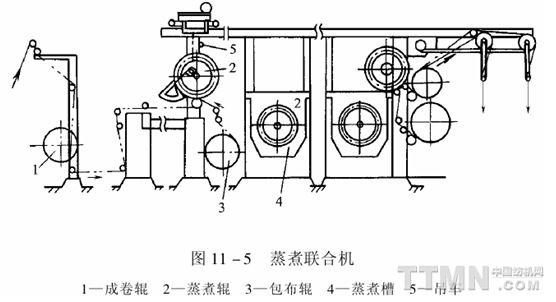 该机能自动卸压,自动往返调头,煮呢时织物内外层温差小,煮呢均匀,同一匹织物质量差异小。煮呢后织物手感丰满、厚实、织纹清晰,不易产生水印。其缺点是定形效果比单槽煮呢差。 3.蒸煮联合机 蒸煮联合机主要由两组蒸煮槽、蒸煮辊、吊车和包布辊组成,如图11—5所示。
