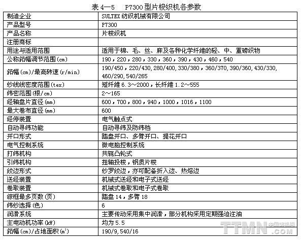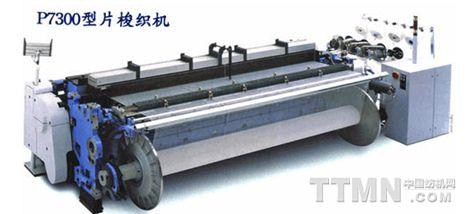 P7300型片梭织机是瑞士SULTEX纺织机械有限公司(原苏尔寿公司)生产的一种片梭织机。 适织品种:可织造各种天然纤维(如棉、毛、丝、麻)及各种人造纤维和合成纤维。可织造20~800 g/m2范围内的轻薄厚重织物,适合于粗纺呢绒、精纺呢绒面料、亚麻、真丝、棉织化纤等各种品种织物。 机器的主要结构特征: (1)采用坚实的铸铁(钢)结构墙板,中间横梁通过螺丝牢固地连接。 (2)传动系统的主电动机通过主传动离合器传动织机主轴,优化了织机的刹车性能,降低了织机承受的刹车动载荷达30%。 (3)投梭机构采用扭轴投梭机构,推动片梭飞行,优化了投梭杆的加速度角度和投梭凸轮的运动夫律曲线,进一步提高了机械效率,使投梭运动和谐平稳,投梭机构的各部件所受应力降低。整个机构采用了定时周期循环润滑系统,投梭侧设置了定时循环吹风清洁系统。 (4)打纬机构的运动是由打纬共轭凸轮伟动筘座来完成的。根据幅宽的不同配置多给共轭凸轮箱。 (5)开口机构分为积极式凸轮开口机构、回转式积极多臂机以及高速边字提花机等。 (6)片梭织机的送经机构按送经的动力来源可分为机械式送经和电子式送经。 (7)根据卷取控制的不同可分为:机械式卷取装置和电子式卷取装置。 (8)配有自动寻纬和慢速传动装置。 (9)润滑系统采用中央集中润滑装置,并附加了对开梭器和片梭的单独润滑装置。 (10)电气控制系统具有如下特点: ①具有横向交叉功能支持; ②自动正纬纱控测器; ③自动优化片梭制梭功能; ④扩展了数据统计功能; ⑤具有较高的机动灵活性以适应优化织造工艺的要求。 (11)微电脑终端采用了触摸屏式图形显示终端,具有人机对话界面,且便于输入工艺参数。能清楚地显示指示和指令,并且具有“帮助”(help)指导的功能。内部设有织物控制系统和数据交换记忆卡等; (12)P7300型片梭织机采用了电子控制的步进电动机来驱动其制动装置。这两种制动装置都可以通过编制程序来精确控制其制动力的大小。