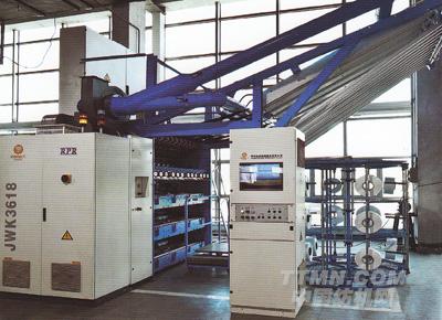 经纬纺机股份有限公司榆次分公司最新推出与意大利RPR公司合作开发成功的全自动高速高效假捻变形机---JWK3618型假捻变形机。该机机械速度可达1500米/分,采用气动生头,自动落筒,导丝盘取代整体罗拉传动结构,导热丝盘代替第二热箱,实现了自动化与高效率的完美结合。各项技术指标均达到国际领先水平。