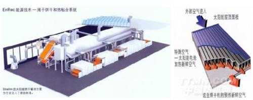 据介绍,瑞士 Strahm 公司主要制造热粘合烘房和烘燥(包括拉幅机)设备。本届展会公司介绍的EnRec6太阳能技术,巧妙利用太阳能屋顶面板等形式,对烘房补充的新鲜空气等工艺介质进行预热,从而达到节能的目的 (图 1)。公司的 EnRec 3 技术则是从设备排出废气中回收热能的装置,这是一个对粉尘不敏感的热交换器,即使粉尘极多,系统依然可保持清洁。