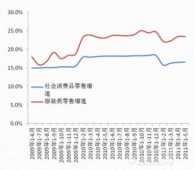 服装类零售增长快:2011年1-5月,社会消费品零售总额同比增长16.6%,其中限额以上服装类零售额同比增长23.5%,高出社会平均6.9个百分点。