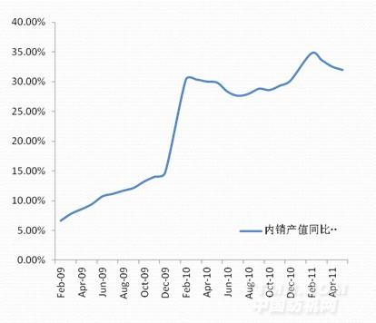 内销产值也有趋缓表现:2011年1-5月,内销产值同比增长31.95%,较一季度减缓1.63个百分点。但内销比重仍继续提升达82.73%,较上年提高了1.31个百分点。