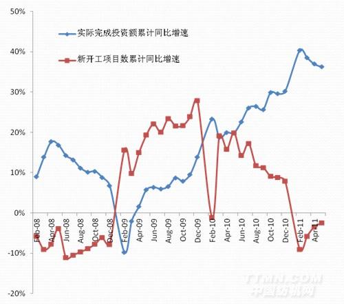 2011年1-6月,全行业实际完成固定资产投资总额同比增长37.56%,增速较一季度回落2.29个百分点;新开工项目同比下降2.52%,较一季度稍有回升3.28个百分点,但仍未扭转负增长态势。