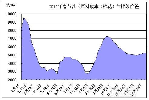 注:图中价差(面积部分)=棉纱价格-提前20-25日棉花价格×1.08。从图中的面积图可以看出,2011年内不同时期,原料成本与棉纱价差非常悬殊,如2月份曾经高达9500余元/吨,而8月初的价差只有2700多元/吨,所以生产棉纱也产生了不同的利润。单就4季度而言,这个价差相对平稳,在5000和6000元/吨之间小幅波动,多数时间在5000元/吨偏上一点。从这个差价来看,4季度的棉纱生产还是有盈利空间的。当然,这些数字是正常生产经营情况下得出的,不包括低价抛库存时的情况。