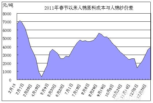 2011年春节以来人棉原料与人棉纱之间的价差变化情况