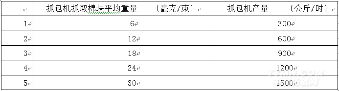 当特品茨勒程序控制型抓包机BLENDOMATBO-A的产量为1500公斤/时,其最大抓取量也只有30毫克。表2所是抓包机抓取重量与产量间的关系。最多可供应3台清棉机或开松生产线。