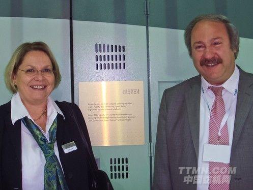 在ITM展会上展出的紧密纺纱机K 45在展会后将捐赠给伊兹密尔的Ege大学。Edda Walraf (立达营销副总裁) 和Hüseyin Kadoğlu教授 (Ege大学) 合影。