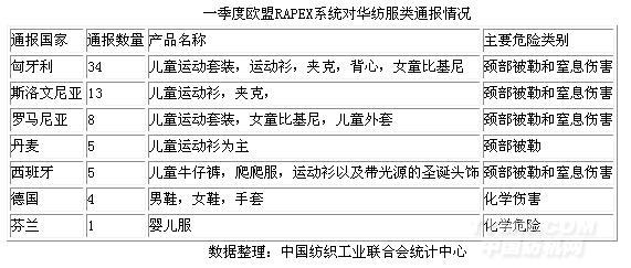 今年一季度欧盟对华纺织服装类产品召回通报中,仍是以服装特别是以儿童服装为主,也包括一些服装配饰和鞋。通报的主要原因依然是不符合欧盟标准EN14682,存在窒息危险(儿童上衣和帽子的抽绳长度超标)、致伤危险(儿童服装的腰部抽绳长度超标)等。被通报的产品,除部分涉及抽绳长度超标的儿童服装被责令采取改正措施外,其他各类产品都或主动或被动地撤出了市场并召回已售出产品,尚未进入欧盟市场的产品则直接被海关拒绝进口。