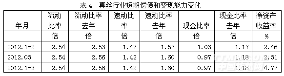 从短期偿债和变现能力的变化看,真丝行业流动比率(流动资产/流动负债)2012年1-3月份为2.54倍,而上年同期为2.56倍,流动比率较高,表明企业短期偿债能力较强;