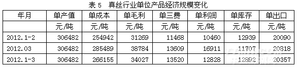 从单位产品经济规模变化情况看,2012年1-3月份我国真丝行业中相对于每吨真丝产量而言,其单产值为306482元/吨,单成本为266155元/吨,单毛利为34027元/吨,单三费为13520元/吨,单利润为12828元/吨,单库存为12892元/吨,单出口为20357元/吨。由此看来,假如把单产值近似看成每吨真丝产量的行业平均参考价格,那么其单成本约占86.84%,单毛利约占11.10%,单三费约占4.41%,单利润约占4.19%,单库存约占4.21%,单出口约占6.64%。