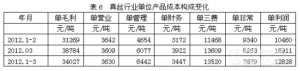 从单位产品成本构成变化情况看,2012年1-3月份我国真丝行业中相对于每吨真丝产量而言,其单毛利为34027元/吨,单营业(单位产品的营业费用)为3630元/吨,单管理(单位产品的管理费用)为6442元/吨,单财务(单位产品的财务费用)为3447元/吨,单三费为13520元/吨,单非常(单位产品的非经常性损益)为7679元/吨,单利润(税前利润)为12828元/吨,如果剔除非经常性损益的影响,单位产品的名义税前利润为20508元/吨。