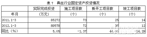 据国家统计局公布的数据,2012年1-3月份真丝行业实际完成投资额8.96亿元,同比增加5.05%;当年以来到目前为止施工项目总数为72个,同比减少1.37%;其中新开工项目数36个,同比增加44.00%;截至3月底为止,已实现竣工项目数12个,同比减少14.29%,占施工项目总数的16.67%,表明该行业投资项目进展较好。