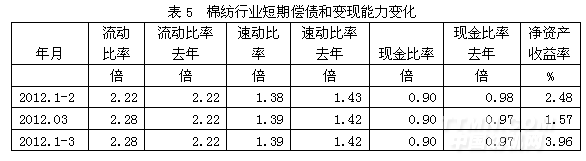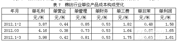 从单位产品成本构成变化情况看,2012年1-3月份我国棉纺织行业中相对于每米棉布产量而言,其单毛利为3.98元/米,单营业(单位产品的营业费用)为0.42元/米,单管理(单位产品的管理费用)为0.81元/米,单财务(单位产品的财务费用)为0.53元/米,单三费为1.75元/米,单非常(单位产品的非经常性损益)为0.63元/米,单利润(税前利润)为1.61元/米,如果剔除非经常性损益的影响,单位产品的名义税前利润为2.23元/米。