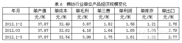 从单位产品经济规模变化情况看,2012年1-3月份我国棉纺织行业中相对于每米棉布产量而言,其单产值为37.87元/米,单成本为32.54元/米,单毛利为3.98元/米,单三费为1.75元/米,单利润为1.61元/米,单库存为1.22元/米,单出口为2.77元/米。由此看来,假如把单产值近似看成每米棉布产量的行业平均参考价格,那么其单成本约占85.93%,单毛利约占10.52%,单三费约占4.62%,单利润约占4.24%,单库存约占3.21%,单出口约占7.32%。