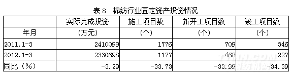 据国家统计局公布的数据,2012年1-3月份棉纺行业实际完成投资额233.07亿元,同比减少3.29%;当年以来到目前为止施工项目总数为1177个,同比减少33.73%;其中新开工项目数468个,同比减少33.99%;截至3月底为止,已实现竣工项目数227个,同比减少34.39%,占施工项目总数的19.29%,表明该行业投资项目进展较好。