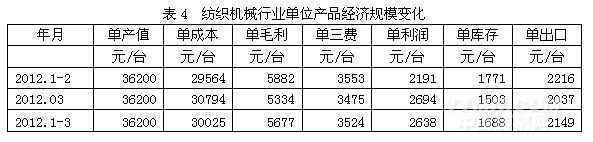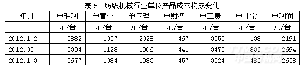 从单位产品成本构成变化情况看,2012年1-3月份我国纺织机械行业中相对于每台纺织机械产量而言,其单毛利为5677元/台,单营业(单位产品的营业费用)为1084元/台,单管理(单位产品的管理费用)为1983元/台,单财务(单位产品的财务费用)为457元/台,单三费为3524元/台,单非常(单位产品的非经常性损益)为-485元/台,单利润(税前利润)为2638元/台,如果剔除非经常性损益的影响,单位产品的名义税前利润为2153元/台。