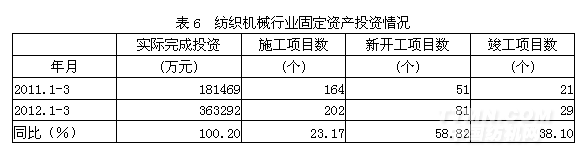据国家统计局公布的数据,2012年1-3月份纺织机械行业实际完成投资额36.33亿元,同比增加100.20%;当年以来到目前为止施工项目总数为202个,同比增加23.17%;其中新开工项目数81个,同比增加58.82%;截至3月底为止,已实现竣工项目数29个,同比增加38.10%,占施工项目总数的14.36%,表明该行业投资项目进展较好。