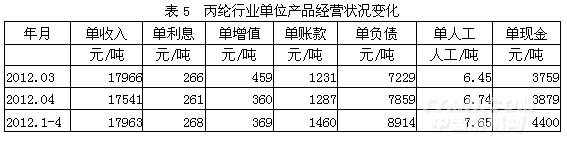 从单位产品经营状况变化情况看,2012年1-4月份我国丙纶行业中相对于每吨丙纶产量而言,其单收入(单位产品的主营收入)为17963元/吨,单利息(单位产品的利息支出)为268元/吨,单增值(单位产品的增值税支出)为369元/吨,单账款(单位产品的应收帐款)为1460元/吨,单负债(单位产品的负债)为8914元/吨,单人工(单位产品的人工消耗)为7.65人工/吨(表示每人每天生产丙纶产量0.131吨/人工),单现金(单位产品的现金流)为4400元/吨。