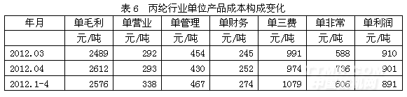 从单位产品成本构成变化情况看,2012年1-4月份我国丙纶行业中相对于每吨丙纶产量而言,其单毛利为2576元/吨,单营业(单位产品的营业费用)为338元/吨,单管理(单位产品的管理费用)为467元/吨,单财务(单位产品的财务费用)为274元/吨,单三费为1079元/吨,单非常(单位产品的非经常性损益)为606元/吨,单利润(税前利润)为891元/吨,如果剔除非经常性损益的影响,单位产品的名义税前利润为1497元/吨。